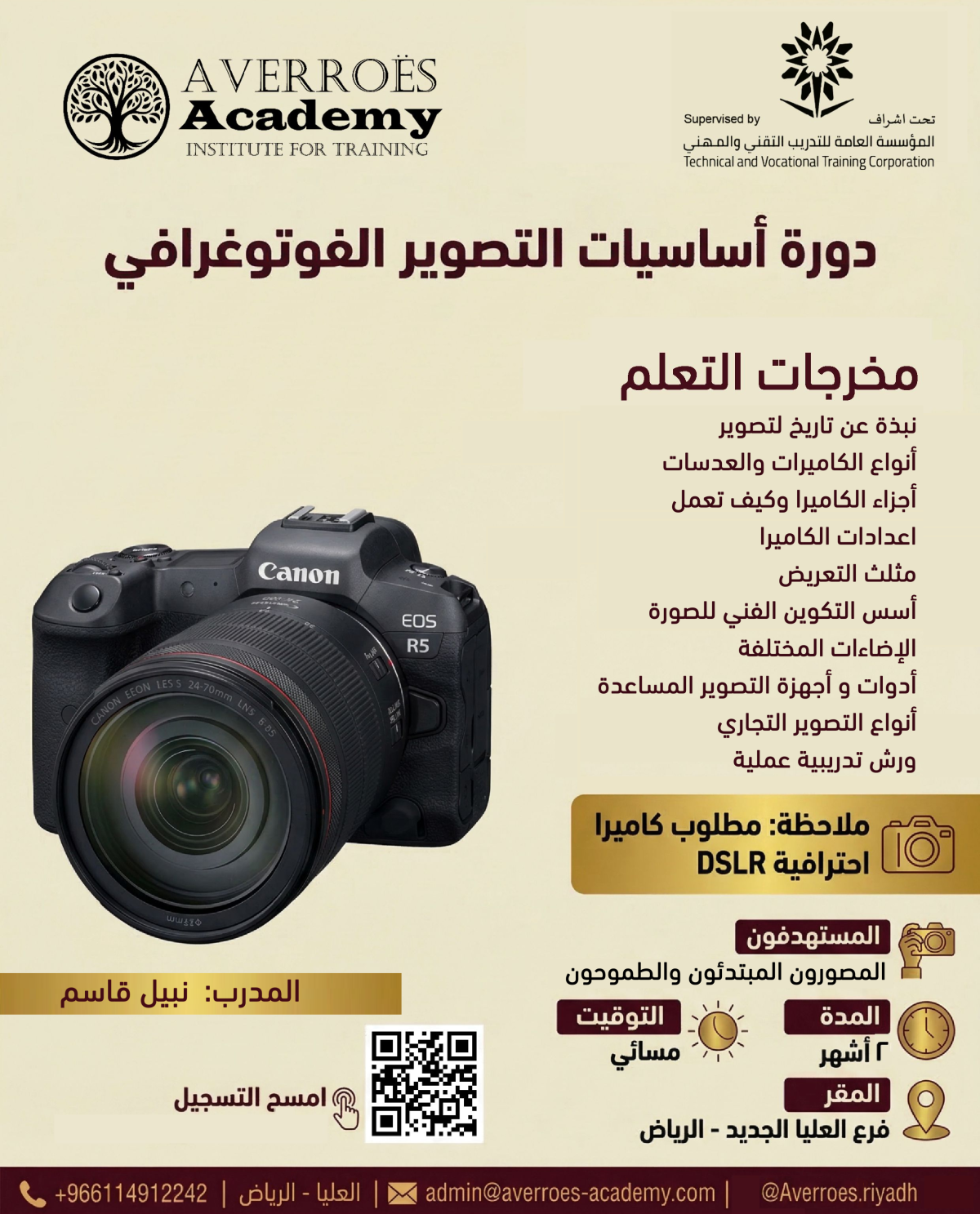 As a fully accredited entity by the Technical and Vocational Training Corporation (TVTC), Averroes Academy is committed to transforming the professional landscape of Riyadh and the wider Kingdom of Saudi Arabia. Our courses are meticulously crafted and government-authorized to align with the demands of the modern, rapidly evolving job market. We offer future-ready, certified skills in high-demand fields such as Artificial Intelligence, Professional Photography, and specialized test preparation.